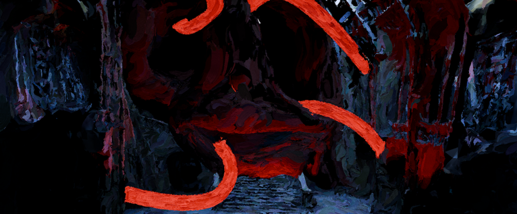 Technically, animating the blood feeding into the demon relied on boolean modifiers. The pipes were paired with a large cube that progressively removed their geometry, revealing the animated blood mass underneath. This method let the flow read clearly even through the painterly filter, which has a tendency to obscure fine detail. The close-up camera was essential for the same reason. At wider angles the swelling would appear ambiguous, and the readability of the facial expression and body inflation would be compromised.