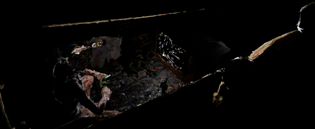 The environment stays completely engulfed in darkness, which is exactly what I want at this stage. The painterly look blends the shadows so everything feels murky and unclear. Small details like the jeans thrown over the chair or the clutter on the floor show how derelict the space is without needing any dialogue. The house feels lived in and abandoned at the same time.